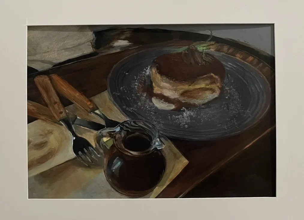 I wanted to focus on capturing the reflection and texture in this still life. I was especially drawn to the lighting on the glass syrup cup. Using acrylic glaze helped me show the different materials, such as the shine of the metal fork, the smooth glass, and the shadows on the paper and plate. Through this piece, I wanted to highlight the beauty in small details and make the scene feel realistic and alive.