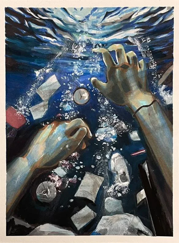 This piece was inspired by a dream I had during finals week, where I was drowning in an ocean surrounded by floating homework papers. I wanted to show how the pressure from school can feel overwhelming and how the environment and surroundings can affect a person. Using markers challenged me to create the movement of the waves while expressing the stress and chaos beneath the surface.