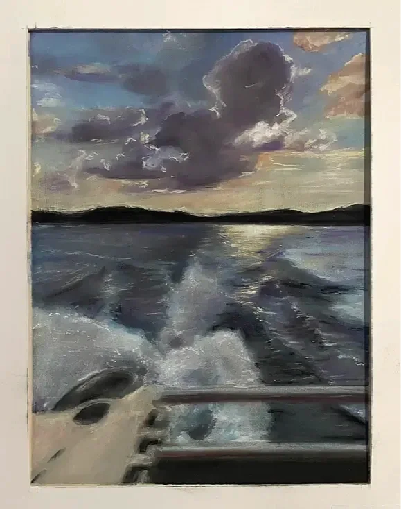 I was inspired by a sunset I saw during a boat ride on Lake Lanier. I want to explore how the colors reflected on the water’s surface and how to capture the movement of the water on a piece of paper. Chalk pastel allows me to focus on creating the positive and negative areas and blending the colors to show the ripples and waves as the boat moved through the water.