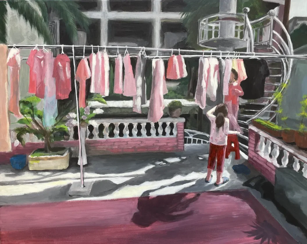 This piece was inspired by a memory of me and my sisters hanging wet clothes on the balcony of our home in China. The scene feels so vivid, yet distant, like something I remember clearly but can never return to. Through this painting, I wanted to express the feeling of longing for a moment that only exists in the memory, a dream I can’t go back to.