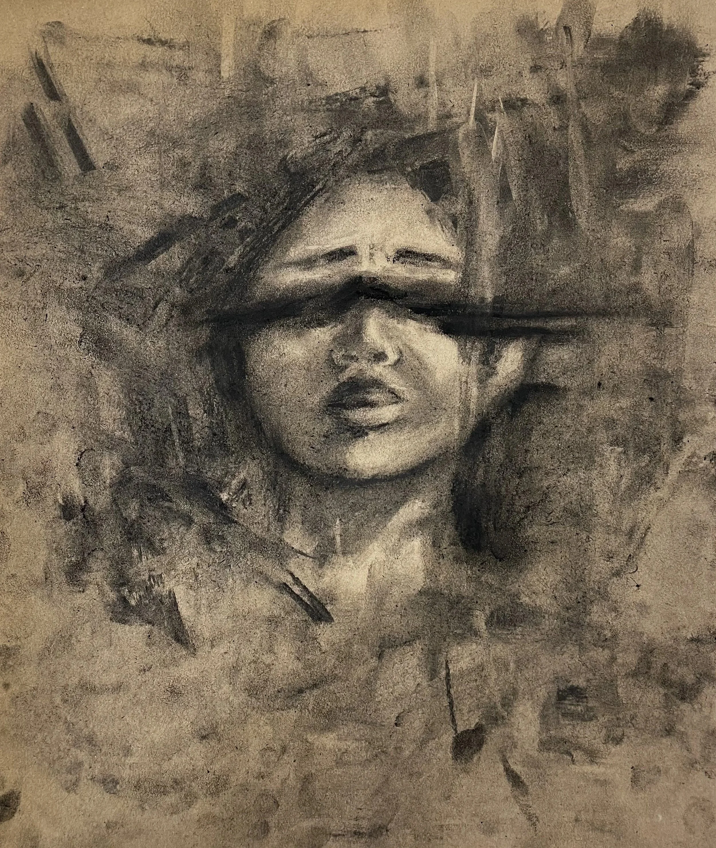 I wanted to explore fear and chaos in this self-portrait. Using charcoal allowed me to create smudged, dark marks that surround the figure, representing a sense of being overwhelmed and uncertain about the future. The blindfold over her eyes shows the fear of not knowing what’s around her, capturing the tension between vulnerability and the unknown.