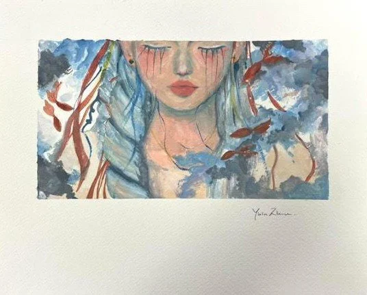 I want to create a dreamlike feeling in this painting, almost like bringing dream to life. The girl with blue hair and closed eyes is surrounded by clouds and small red fish, floating as if in another world. I used blue for the shadows to bring out a pastel tone that contrasts with the bright red fish. I captured a quiet, dreamlike moment that is filled with the imagination that only a dream can have.